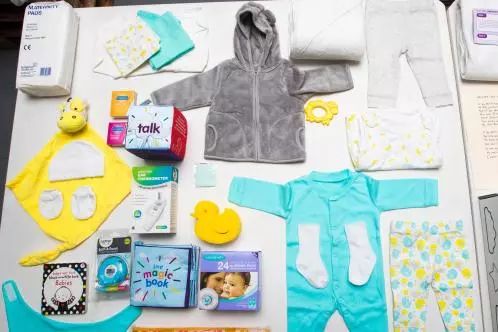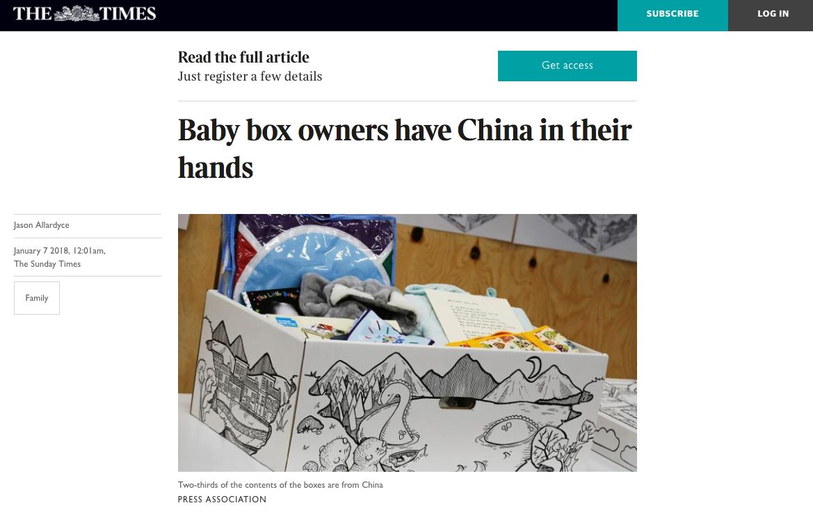 嬰兒箱里的嬰兒睡袋、背心、褲子、手套和帽子都是中國(guó)制造,甚至連圍嘴、浴巾、指甲銼和溫度計(jì)等一些物件也來(lái)自中國(guó)。盒子里只有毯子和毛巾是由歐洲制造的,產(chǎn)婦衛(wèi)生巾來(lái)自英國(guó)諾丁漢郡,而一本精裝書由倫敦出版。