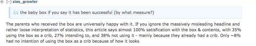 有網(wǎng)友說(shuō),“許多收到盒子的父母都很滿意,盒子里的東西可以給小寶寶用,而盒子本身還可以當(dāng)成一個(gè)嬰兒床?!?/p>