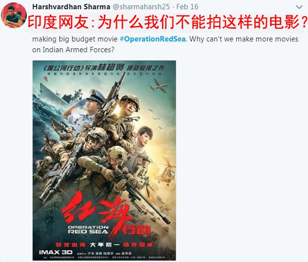 有意思的是,看到《紅海行動》如此刷屏,一位印度網(wǎng)友顯然很是“眼紅”。他不無羨慕嫉妒地問道:“為什么我們印度就不能拍這樣的電影呢?”