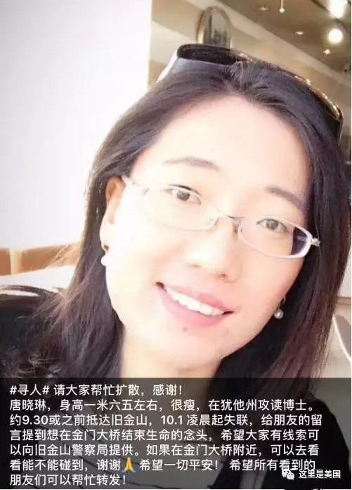 2017年10月,一則關(guān)于失蹤中國(guó)女留學(xué)生的尋人信息在美國(guó)引發(fā)關(guān)注:一名畢業(yè)于北京大學(xué)2004級(jí)空間物理專業(yè),在美國(guó)猶他州大學(xué)做導(dǎo)師助理研究員的唐曉琳在舊金山失聯(lián)。