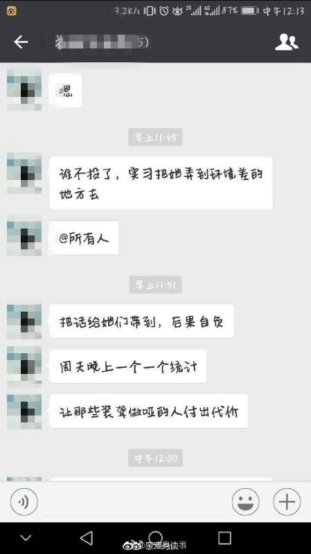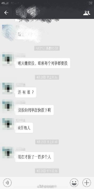 該網(wǎng)友提供的聊天截圖顯示,一個(gè)昵稱(chēng)叫“大江東去”的人4月21日在班級(jí)微信群中說(shuō)“明天繼續(xù)投,咱班每個(gè)同學(xué)都要投”“沒(méi)投的同學(xué)趕快投下”“現(xiàn)在才投了一百多個(gè)人”。在另一個(gè)名叫“首腦交流群”的微信群中,“大江東去”對(duì)班干部說(shuō):“誰(shuí)不投了,實(shí)習(xí)把她弄到環(huán)境差的地方去”“把話給她們帶到,后果自負(fù)”“周天晚上一個(gè)一個(gè)統(tǒng)計(jì)”“讓那些裝聾作啞的人付出代價(jià)”。