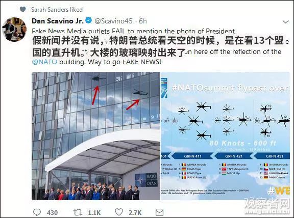 但是,白宮社群媒體主任史卡比諾 (Dan Scavino Jr。)卻站出來指責(zé)“假新聞”。他表示,當(dāng)時(shí)各國領(lǐng)導(dǎo)人正在抬頭看天空中飛過的13國直升機(jī),并配上了一張動(dòng)作整齊劃一的照片。