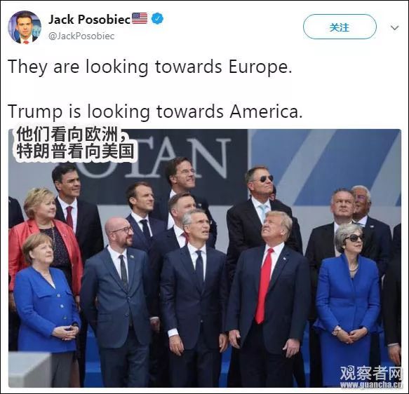 而這張神奇的照片里,幾乎所有人,包括法國總統(tǒng)馬克龍、德國總理默克爾、英國首相特蕾莎·梅這些“老朋友”,都看向自己的左邊,而特朗普則執(zhí)著地望向右邊的天空。