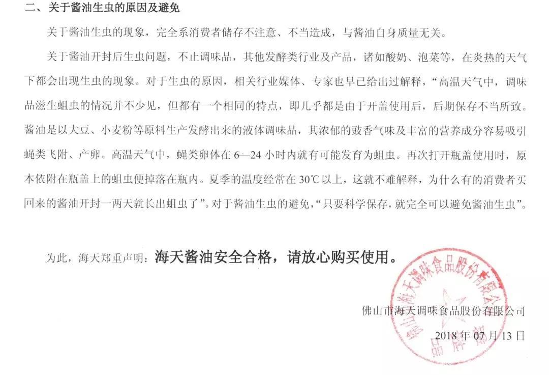 海天回應(yīng)醬油生蛆系消費(fèi)者保存不當(dāng)