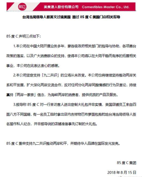 目前,針對蔡英文“訪問”其美國店面而引起了強烈輿論風波,“85度C”剛剛在其開設在大陸微博和微信平臺的賬號上發(fā)布了一則聲明,強調(diào)其支持“九二共識”和“反對任何分化兩岸同胞情感的行為及言論”。