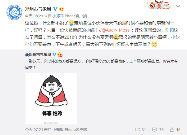 眾多網(wǎng)民發(fā)現(xiàn)不能玩雪,于是組隊(duì)去玩“鄭州市氣象局”了。在“鄭州市氣象局”的新浪微博上,網(wǎng)友有的調(diào)侃,有的逼問,把氣象局的小編已經(jīng)“逼瘋”。目前,該小編已經(jīng)開始在微博上暴走,每小時(shí)更新一次微博,并且和每位回復(fù)的粉絲“較真”的討論起這讓人瘋狂的“暴雪”為什么還不來。
