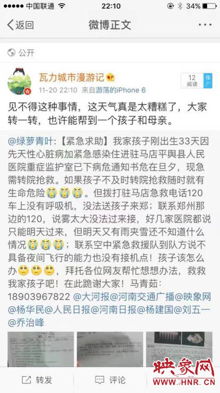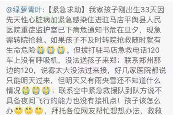 11月20日晚,一條微博牽動著無數(shù)人的心。駐馬店平輿縣一個剛剛出生33天的嬰兒因先天性心臟病加緊急感染被駐馬店市平輿縣人民醫(yī)院下達了病危通知書,但當?shù)蒯t(yī)療條件有限,患兒無法得到及時有效的治療,急需轉院治療,但聯(lián)系的鄭州醫(yī)院因為天氣原因無法前往。