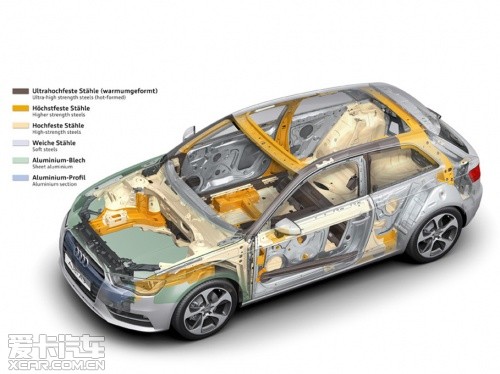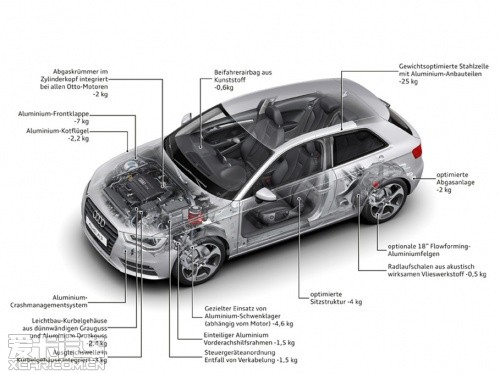 “輕量化”之于奧迪,已然成為品牌精髓所在,截止2011年已有70萬(wàn)輛裝備了AFS輕質(zhì)車架的奧迪汽車駛下生產(chǎn)線。全新一代奧迪A3相比老款的減重達(dá)到了80千克,首當(dāng)其沖的就是采用了復(fù)合材料車架,車架型材包括了奧迪擁有自主知識(shí)產(chǎn)權(quán)的:超硬鋼、先進(jìn)高強(qiáng)度鋼、高強(qiáng)度鋼、低碳鋼以及鋁板。這些不同材料通過(guò)多種連接方式構(gòu)成了強(qiáng)度大幅提升的車身,同時(shí)重量下降了18千克。而大眾集團(tuán)最新的“MQB”橫置發(fā)動(dòng)機(jī)模塊化平臺(tái)則能夠幫助奧迪A3進(jìn)一步減輕重量,比如A3使用的前輪鋁制副車架就帶來(lái)了6千克的減重效果。