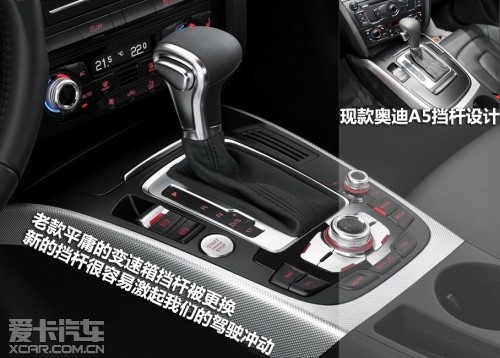 雖然新款?yuàn)W迪A5的中控臺(tái)布局沒有進(jìn)行新的設(shè)計(jì),但是新車采用了全新設(shè)計(jì)的儀表盤,一體化設(shè)計(jì)的儀表與內(nèi)飾的融合更加緊密。另外老款平庸的變速箱擋桿被更換,新的擋桿很容易激起我們的駕駛沖動(dòng),另外新車在MMI操作面板的很多細(xì)節(jié)上也有變化。