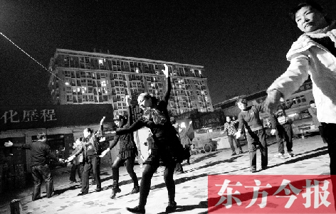 一塊百十平方米的小場(chǎng)地,距離居民樓不到10米。一盞探照燈,一個(gè)可滑動(dòng)的大音響,伴隨著歌曲,三三兩兩的人就火熱開跳了。不遠(yuǎn)處,陸續(xù)還有人來。甩開外套,加入隊(duì)伍中。