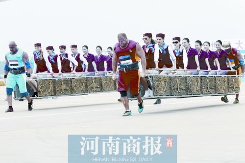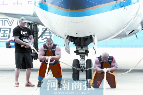 昨天下午3時許,鄭州新鄭國際機場。2013年世界大力士爭霸賽重頭戲——拉飛機比賽,在此上演。
