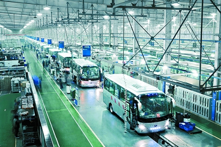 4月19日,現(xiàn)代化的宇通客車生產(chǎn)線正快速運(yùn)轉(zhuǎn)。今年一季度,鄭州宇通客車股份有限公司共銷售各類客車10168輛,成為行業(yè)內(nèi)唯一超過萬輛的企業(yè)。其中,共出口各類客車1531輛,出口額達(dá)到了10.12億元,出口量和出口額均名列行業(yè)第一。 河南日?qǐng)?bào)記者 王 錚 攝