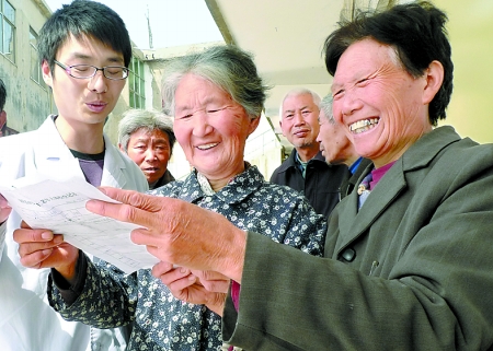 4月26日,湯陰縣白營(yíng)鄉(xiāng)東木佛村老人們正在看自己的體檢報(bào)告。4月份,湯陰縣5萬(wàn)多名60歲以上農(nóng)村老人享受到了一次免費(fèi)健康體檢,體檢費(fèi)用由政府買(mǎi)單。 常中正 攝