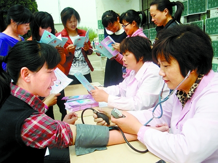 4月25日,商水縣舒莊鄉(xiāng)計(jì)生技術(shù)人員正在該鄉(xiāng)一中為教師進(jìn)行體檢。“五一”前夕,他們深入學(xué)校、機(jī)關(guān)、企業(yè)、田間,為辛勤工作在一線的廣大勞動(dòng)者免費(fèi)進(jìn)行健康檢查,并發(fā)放醫(yī)療保健知識(shí)手冊(cè)。 喬連軍 攝