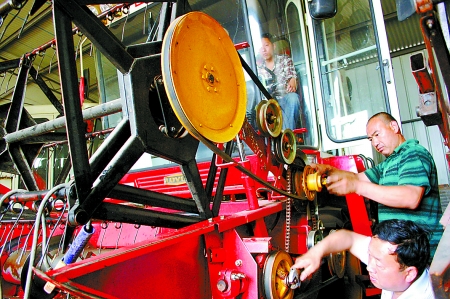 5月7日,武陟縣農(nóng)機(jī)局的技術(shù)人員正在幫助農(nóng)機(jī)手檢修小麥?zhǔn)崭顧C(jī)?!叭摹迸R近,武陟縣農(nóng)機(jī)局組織技術(shù)人員深入鄉(xiāng)村,對(duì)全縣參加跨區(qū)作業(yè)的800多臺(tái)小麥聯(lián)合收割機(jī)進(jìn)行全面檢修,并對(duì)機(jī)手進(jìn)行安全操作技能培訓(xùn),做好參加跨區(qū)麥?zhǔn)铡皶?huì)戰(zhàn)”的準(zhǔn)備。 馮小敏 李福利 攝