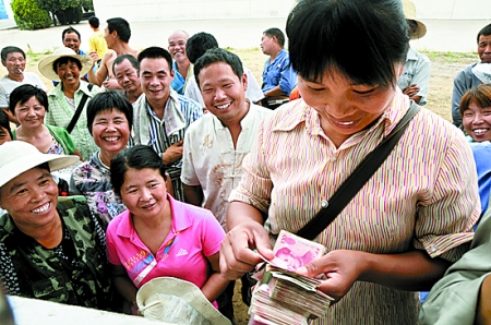 6月26日,在省糧油對(duì)外貿(mào)易有限公司郾城糧食儲(chǔ)備庫(kù),前來(lái)賣(mài)糧的農(nóng)民高興地?cái)?shù)著手中的鈔票。