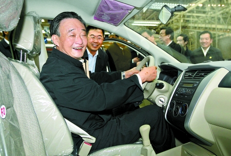 4月13日,中共中央政治局常委、全國人大常委會委員長吳邦國在東風日產(鄭州)有限公司考察工作。圖為吳邦國委員長坐上一輛銀色樣車,查看車內配置情況。 河南日報記者 郭 宇 李建峰 攝