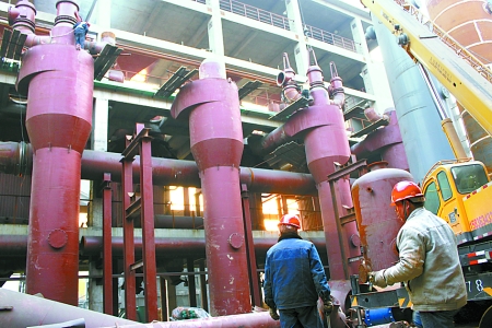 3月16日,河南煤化安化集團(tuán)公司造氣系統(tǒng)16臺(tái)新型節(jié)能造氣爐技術(shù)改造項(xiàng)目正在緊張施工,項(xiàng)目全部投產(chǎn)后,每噸合成氨耗煤有望下降10%以上,年增經(jīng)濟(jì)效益5000萬(wàn)元。 李希軍 攝