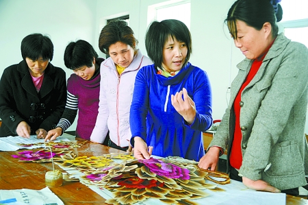4月16日,汝南縣明振麥草畫工藝品廠的工人們正在一起交流制作技術。該企業(yè)的麥草畫暢銷日、韓等60多個國家,帶動當?shù)?00多名婦女就業(yè)。
