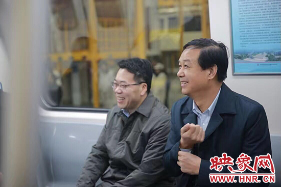“滎陽造”首列地鐵列車正式下線后,滎陽市委書記宋書杰(右一)坐上列車參觀。