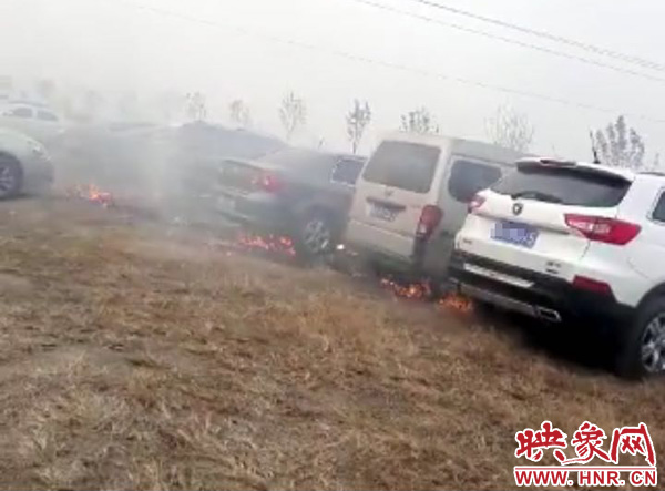 緊跟著沒多長時間,另一則9秒鐘的視頻則也開始瘋狂傳開。視頻中五輛私家車已經(jīng)燃起熊熊大火。有網(wǎng)友直接在微信朋友圈中聲稱,鞏義萬安山村民上墳引發(fā)山火引燃五輛私家車。