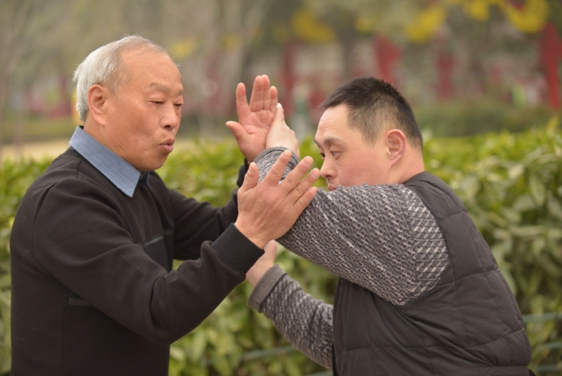 談起和周遠(yuǎn)的結(jié)緣,聶玉璽如數(shù)家珍。4年前,聶玉璽在鄭州人民公園練拳。一個(gè)小伙子站在旁邊目不轉(zhuǎn)睛地看。經(jīng)過了解,聶玉璽得知,周遠(yuǎn),38歲,因小時(shí)候有病,反應(yīng)遲鈍,有自閉傾向,不愛與人交流,很少有人愿意教他。周遠(yuǎn)的父母說起兒子就掉淚。