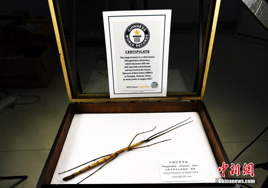 圖為中國巨竹節(jié)蟲(Phryganistria chinensis Zhao )最長個(gè)體,與獲得的吉尼斯世界紀(jì)錄證書。