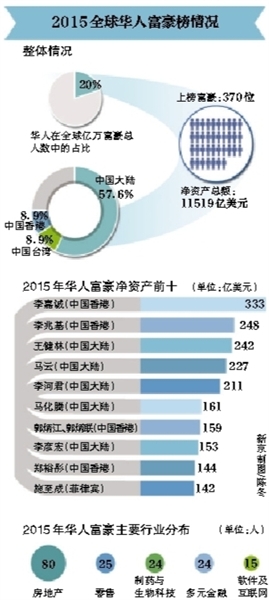 從行業(yè)分布看,華人富豪前十中,房地產(chǎn)巨頭依然占據(jù)最多席位。此外,2015年上榜的370位華人富豪中,房地產(chǎn)依舊牢牢占據(jù)著第一的位置,有80位、超過20%的華人富豪涉足房地產(chǎn)行業(yè)。其中,大連萬達(dá)集團(tuán)董事長(zhǎng)王健林以凈資產(chǎn)242億美元躋身前三,也是大陸富豪第一位。(記者 梁薇薇)