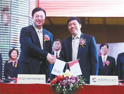 6月8日,中國中車股份有限公司副董事長劉化龍(左)與上海證券交易所副總經理徐明簽訂《上市協(xié)議書》。當日,中國中車在上交所鳴鑼上市。