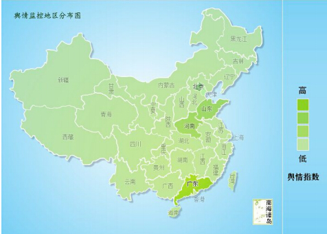 下圖為輿情監(jiān)控地區(qū)分布圖,大象輿情研究院通過對(duì)此事件相關(guān)報(bào)道網(wǎng)站ICP監(jiān)管所屬地區(qū)的挖掘分析,廣東媒體的傳播活躍度最高,這與廣東地區(qū)歷來開風(fēng)氣之先、敢作敢為的特征相吻合;其次是 北京、山東、河南的媒體。