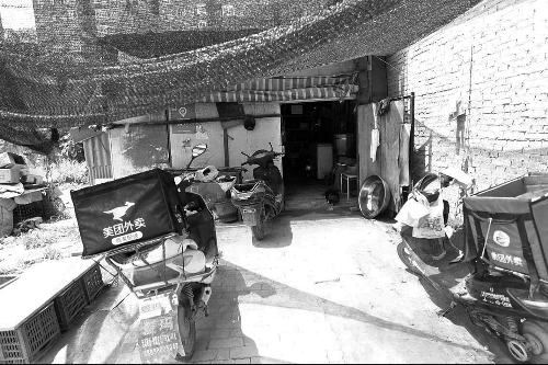 一處問題作坊外,停著兩輛美團(tuán)外賣的“送餐車”