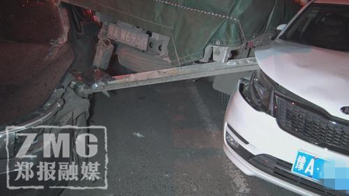 鄭報融媒記者看到,肇事寶馬車為懸掛豫A號牌的灰色5系轎車,該車車頭左側(cè)撞擊卡車后保險杠后受損嚴重,受傷部位由車身延伸至駕駛艙,鐵質(zhì)車身被劃開一道約20厘米寬的口子,駕駛位上方車頂部位則卡在了卡車車尾之下。