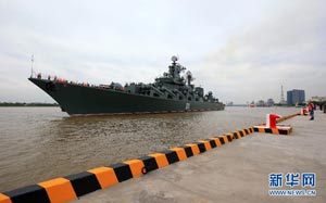 當(dāng)日,參加中俄“海上聯(lián)合—2014”軍事演習(xí)的俄方艦艇陸續(xù)駛抵上海某軍港。中俄兩國海軍互鳴禮炮,中方為來訪的俄艦舉行隆重歡迎儀式。俄羅斯太平洋艦隊旗艦“瓦良格”號導(dǎo)彈巡洋艦駛?cè)胲姼蹠r,參加歡迎儀式的軍樂隊奏響歡迎曲。隨后,“快速”號驅(qū)逐艦、“潘捷列耶夫海軍上將”號大型反潛艦、“伊利姆”號中型海洋油船、“涅維爾斯科伊海軍上將”號大型登陸艦,“卡拉爾”號海洋拖船陸續(xù)駛?cè)敫劭凇_@次聯(lián)合軍事演習(xí),中俄海軍都派出了主戰(zhàn)艦艇參加。中方參演兵力包括導(dǎo)彈驅(qū)逐艦、導(dǎo)彈護(hù)衛(wèi)艦、綜合補(bǔ)給艦以及導(dǎo)彈艇等水面艦艇8艘、潛艇2艘、固定翼飛機(jī)9架。俄方參演兵力包括巡洋艦、反潛艦、驅(qū)逐艦、登陸艦、油船和海洋拖船等水面艦艇6艘。此外,為執(zhí)行海上聯(lián)合解救被劫持船只、護(hù)航等特殊任務(wù),雙方還派出艦載直升機(jī)、特戰(zhàn)分隊等兵力參加此次演習(xí)。新華社記者 查春明攝