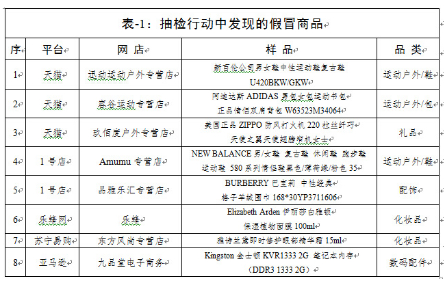 工商總局公布“雙11”期間對(duì)電商平臺(tái)促銷商品的抽檢結(jié)果:已確認(rèn)8批次樣品為假冒商品,天貓3個(gè),1號(hào)店2個(gè),樂蜂網(wǎng)、蘇寧易購(gòu)、亞馬遜各1個(gè);7批次樣品涉嫌假冒商品正在分析中。另有7批次樣品質(zhì)量不合格或標(biāo)簽不合法。