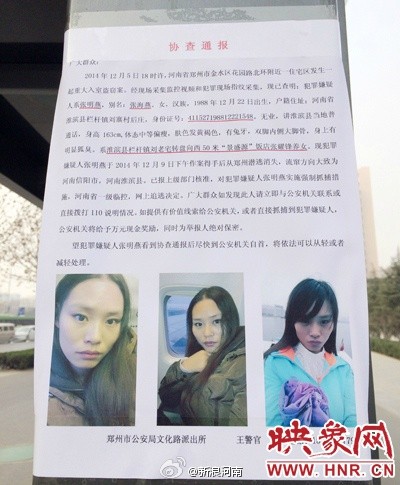 2014年12月5日,鄭州花園路北環(huán)附近一住宅區(qū)發(fā)生一起重大入室盜竊案,嫌疑人盜竊20余萬元財(cái)物后潛逃。現(xiàn)查明:犯罪嫌疑人張明燕,女,26歲,有兔牙,身上有明顯狐臭。警方發(fā)布協(xié)查通報(bào),懸賞萬元緝拿。管你是誰,轉(zhuǎn)發(fā),幫警方追逃!