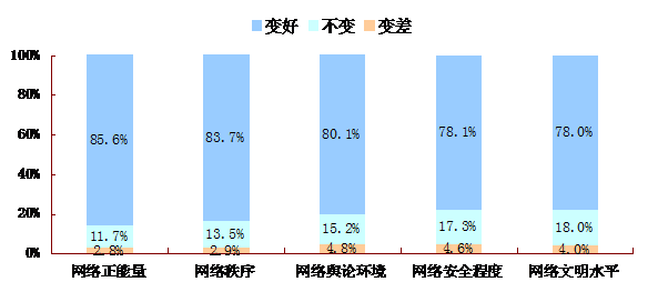 相應(yīng)地,表示網(wǎng)絡(luò)環(huán)境不變或變差的網(wǎng)民比例很低。其中,表示網(wǎng)絡(luò)環(huán)境不變的網(wǎng)民比例普遍在10%-20%之間,表示網(wǎng)絡(luò)環(huán)境變差的網(wǎng)民比例則均低于5%。