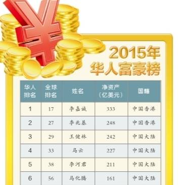 昨日《福布斯》雜志中文版發(fā)布2015華人富豪榜。李嘉誠以凈資產(chǎn)規(guī)模333億美元再次蟬聯(lián)第一;李兆基第二;王健林第三,凈資產(chǎn)達(dá)242億美元,雄霸內(nèi)地首富。河南共有4位企業(yè)家上榜,天瑞集團董事長李留法以凈資產(chǎn)規(guī)模21億美元領(lǐng)跑。