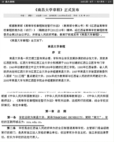 據(jù)了解,近日南昌大學(xué)在官方主頁南昌大學(xué)新聞網(wǎng)正式發(fā)布了《南昌大學(xué)章程》。記者看到,該章程系根據(jù)教育部《高等學(xué)校章程制定暫行辦法》和《江西省高等學(xué)校章程核準(zhǔn)辦法(試行)》精神,經(jīng)江西省高等學(xué)校章程核準(zhǔn)委員會第2次會議評議,并報省人民政府同意,教育廳核準(zhǔn)發(fā)布。