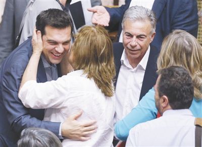 11日,希臘議會(huì)通過旨在解決債務(wù)問題的新協(xié)議草案,議員擁抱總理齊普拉斯表示祝賀。