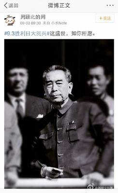 讓人難忘的細(xì)節(jié)不僅僅在閱兵場上。3日上午9時30分,習(xí)近平主席偕夫人彭麗媛正在天安門迎候各國嘉賓,閱兵尚未正式開始,會場內(nèi)外興奮期待的氛圍漸濃。就在此時,網(wǎng)友“周顧北的周”發(fā)布了一條微博“這盛世,如你所愿”,配圖是一張周恩來總理的老照片。短短的七字微博引發(fā)了網(wǎng)友的強烈共鳴,轉(zhuǎn)發(fā)已過百萬?!伴_國大典的時候飛機不夠,周總理說飛兩遍,現(xiàn)在再也不需要飛兩遍了,要多少有多少。山河猶在,國泰民安。當(dāng)年送你的十里長安街,如今已是十里繁榮?!?/p>