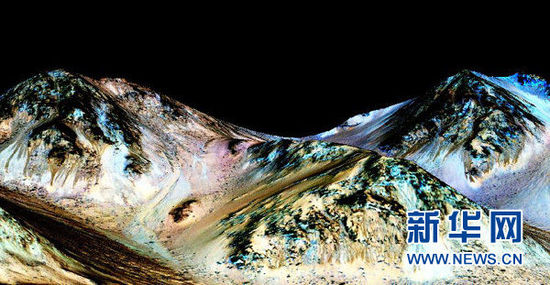 9月28日,在美國(guó)首都華盛頓,這張由美國(guó)航天局和亞利桑那大學(xué)聯(lián)合發(fā)布的圖片顯示,火星山丘上的“季節(jié)性斜坡紋線”是火星表面有液態(tài)水的有力證據(jù)。美國(guó)航天局28日宣布,在火星表面發(fā)現(xiàn)了有液態(tài)水活動(dòng)的“強(qiáng)有力”證據(jù)。