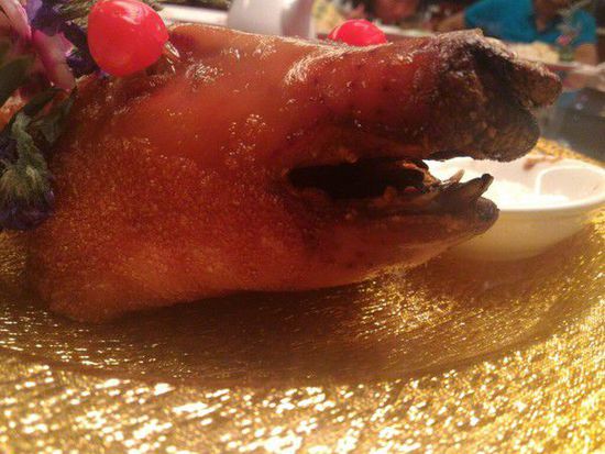 這名被嚇壞的網(wǎng)友,當(dāng)晚將照片發(fā)到網(wǎng)絡(luò),請大家來告訴他這到底是甚么動物。金黃色的盤子上放了“不知名的動物”,眼睛上被插了兩顆櫻桃,尾巴直挺挺的立著,似豬又如鼠一般。