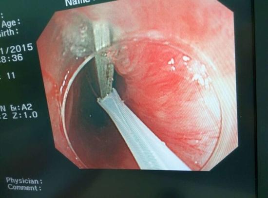 隨后,范醫(yī)生先用圈套器套取出了長(zhǎng)10厘米的鑷子,再一個(gè)一個(gè)地取出了打火機(jī)。整個(gè)取出過程小心謹(jǐn)慎而又一氣呵成,只用了不到10分鐘。
