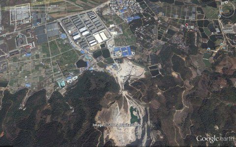 圖片來自谷歌衛(wèi)星圖。2008年2月,采石場(chǎng)內(nèi)碎石遍布白色一片,坑底大量積水已形成了一個(gè)小型水庫(kù)。
