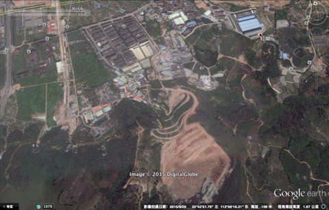 圖片來自谷歌衛(wèi)星圖。2015年9月,采石場(chǎng)已成為渣土填埋場(chǎng),此前裸露在外的白色碎石被紅黃色的泥土所掩蓋。