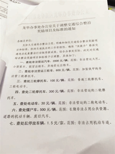 記者在一份由深圳龍華新區(qū)龍華辦事處辦公室出具的《關(guān)于調(diào)整交通綜合整治獎勵(lì)項(xiàng)目及標(biāo)準(zhǔn)的通知》的文件中發(fā)現(xiàn),為加大交通綜合整治力度,明確和細(xì)化交通綜合整治獎勵(lì)項(xiàng)目和標(biāo)準(zhǔn),保持交通執(zhí)法的工作積極性,辦事處決定對交通綜合整治獎勵(lì)項(xiàng)目和標(biāo)準(zhǔn)予以調(diào)整,其中加裝鐵甲的非法營運(yùn)三輪車每查處一輛獎勵(lì)600元,普通三輪摩托車、三輪電動車每輛獎勵(lì)100元,對無證駕駛、妨礙執(zhí)法當(dāng)事人實(shí)施行政拘留的,拘留一人獎勵(lì)500元。
