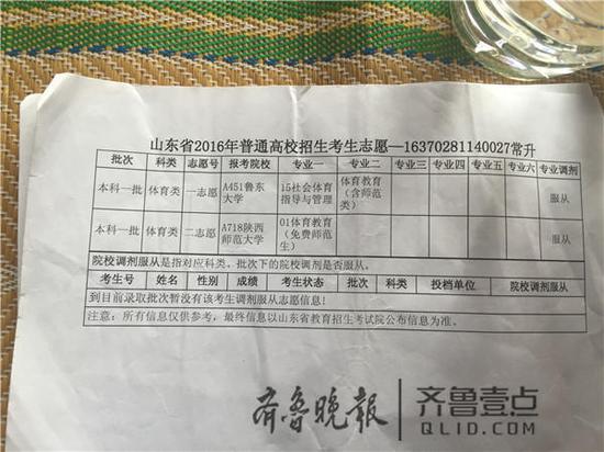 陜西師范大學在山東招收6名體育教育專業(yè)的學生,均為免費師范生。第一志愿的錄取線為文化課362分,專業(yè)課66.54分。學校按照專業(yè)課成績由高到低擇優(yōu)錄取。常升的文化課考了403分,專業(yè)課考了93.64分,遠超出學校的錄取線。而魯東大學官網顯示,該校社會體育指導與管理專業(yè)的文化課最低錄取分數(shù)為407分,而常升的文化課成績差4分。不過,該校對專業(yè)課要求低,專業(yè)課成績最高分僅為77.65分。