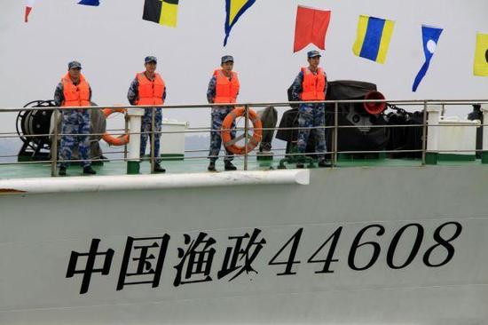 資料圖片:2013年3月30日,赴黃巖島護(hù)漁執(zhí)法中國漁政44608船駛?cè)肷穷^海灣。當(dāng)日上午,中國漁政44608船歷時23天、順利完成黃巖島護(hù)漁執(zhí)法巡航任務(wù)返回廣東汕頭港。新華社發(fā)(姚軍 攝)