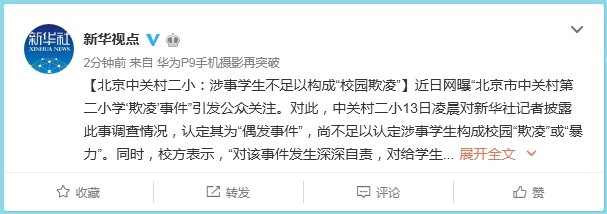 【北京中關(guān)村二?。荷媸聦W(xué)生不足以構(gòu)成“校園欺凌”】近日網(wǎng)曝“北京市中關(guān)村第二小學(xué)‘欺凌’事件”引發(fā)公眾關(guān)注。對(duì)此,中關(guān)村二小13日凌晨對(duì)新華社記者披露此事調(diào)查情況,認(rèn)定其為“偶發(fā)事件”,尚不足以認(rèn)定涉事學(xué)生構(gòu)成校園“欺凌”或“暴力”。同時(shí),校方表示,“對(duì)該事件發(fā)生深深自責(zé),對(duì)給學(xué)生及家長(zhǎng)帶來的傷害,深表歉意”,將汲取教訓(xùn),以此為鑒,本著認(rèn)真理性、客觀公正的原則,妥善處理。(新華社記者魏夢(mèng)佳、梁天韻)