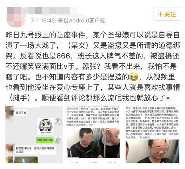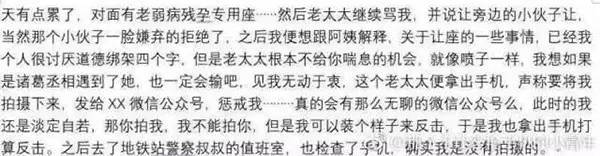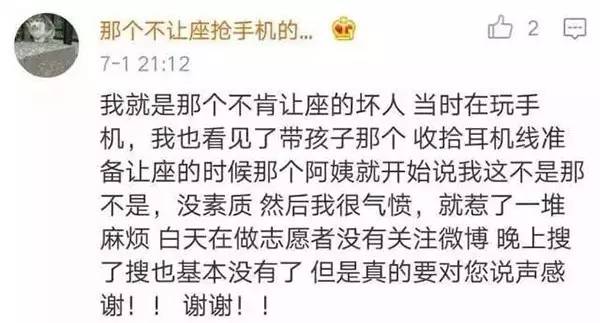 7月1日,該男子發(fā)微博稱,他原本收拾耳機準備讓座的,這時大媽就開始說他這不是那不是,說得他很氣憤,就賭氣不讓了。